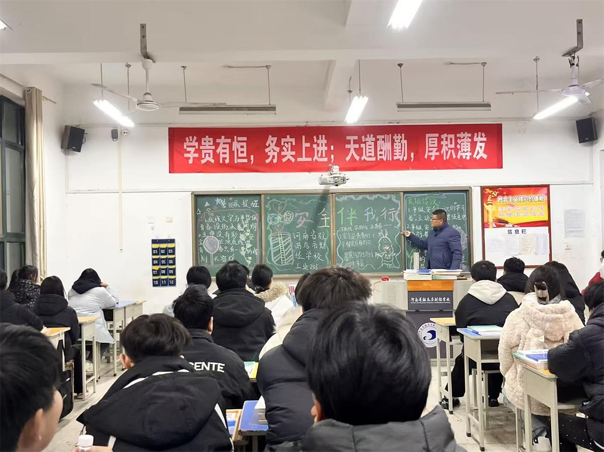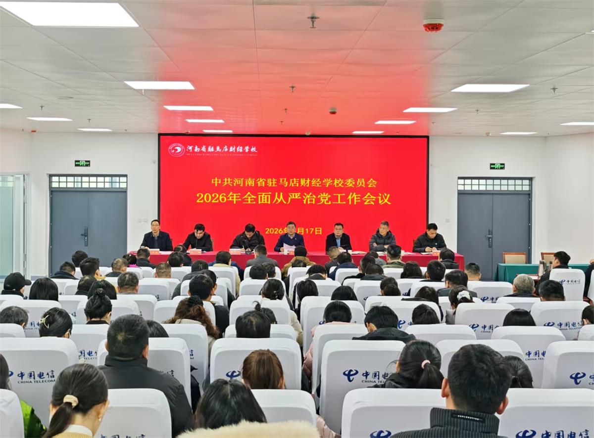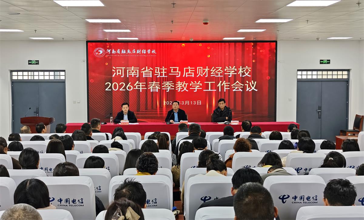 3月13日下午,河南省驻马店财经学校在图书楼一楼西报告厅召开2026年春季教学工作会议。校长于建昌、全体专兼职教师及全体班主任参加会议,会议由副校长周志礼主持。会上,教务处负责人花文俊针对本学期教学工